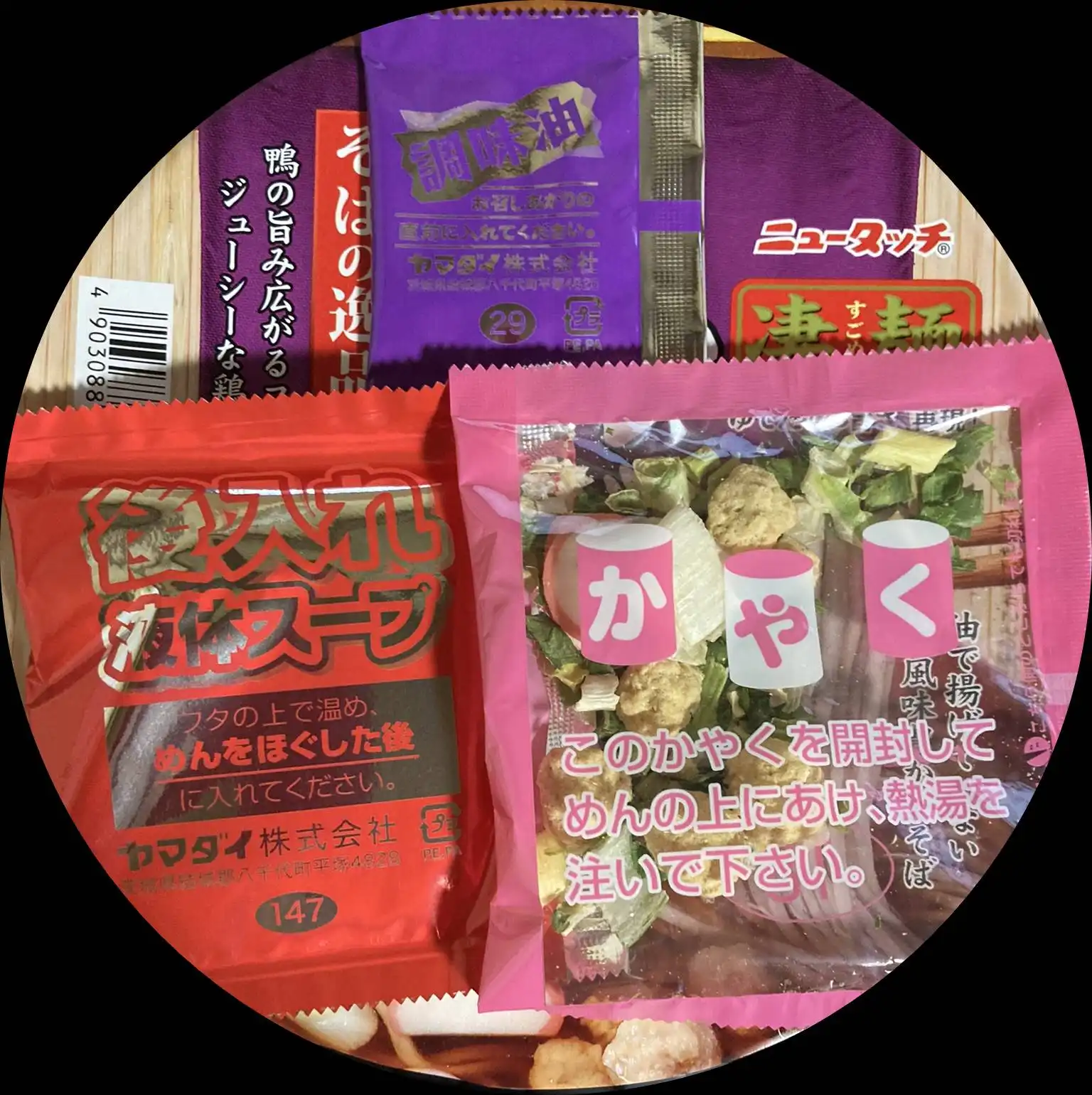 ニュータッチ 凄麺 – そばの逸品鴨だしそばの「かやく&スープ」