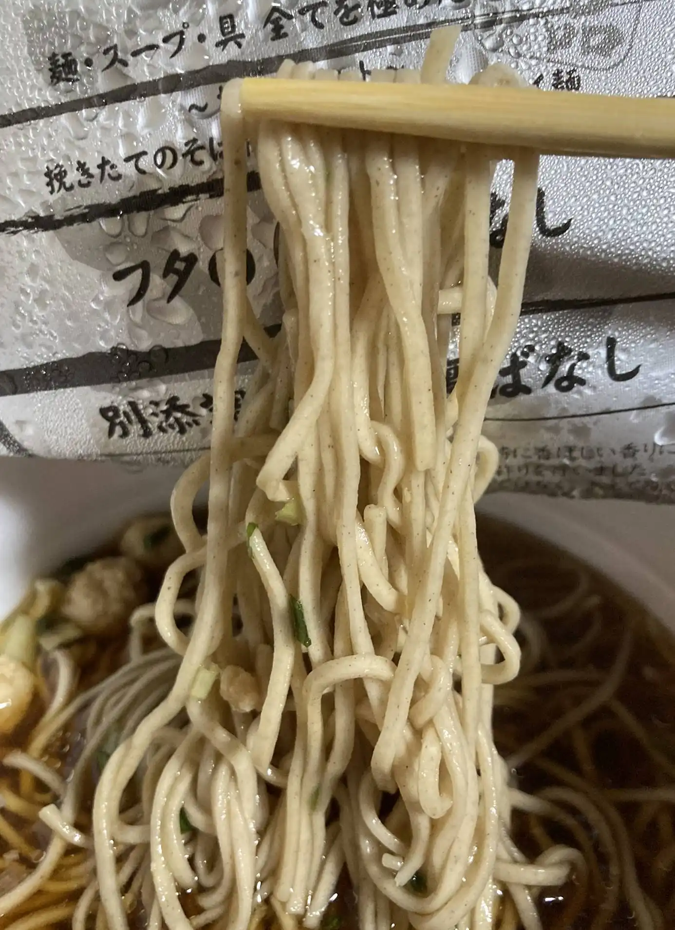思えば「ノンフライの蕎麦」って食べたこと無いんですけど、いい意味で従来のカップそばと左程変わらない印象ながらも生麺を感じさせる食感と風味で、コシも適度な強さで食べやすかったです。